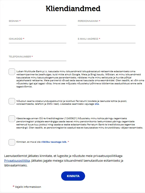 3. Sisesta andmed – Nüüd pead sisestama ka oma andmed, sh isikuandmed ja info sissetuleku/väljaminekute kohta.